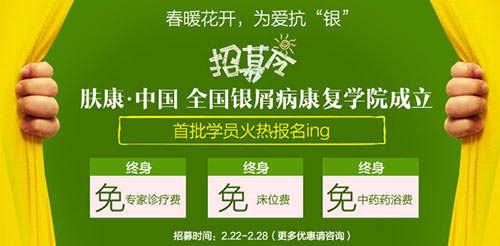 肤康.中国“全国银屑病学院”为此配备了在临床工作几十年的老医生和老教授,加入肤康?中国"全国银屑病学校"成为学员,可以终身免医生诊疗费、终身免床位费、终身免中药药浴费,全国20多家医院任您选择。